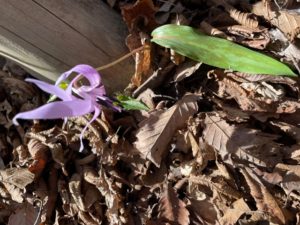 途中で見かけたカタクリの花。花が咲くまでに7年もかかるそうです!